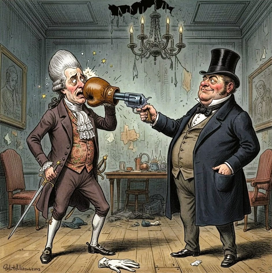 Карикатура Джеймса Гилла, размещенная в публикации, интересна и предельно саркастична. Но опустим ее художественную ценность и рассмотрим ее как эпизод конфликтной ситуации: в которой один персонаж действует «по кодексу», другой — «по результату». Белая перчатка как символ «ритуала традиционной чести» и револьвер в боксёрской перчатке как символ обхода правил — это столкновение эстетики и эффективности. В вопросах безопасности такая дилемма возникает постоянно.